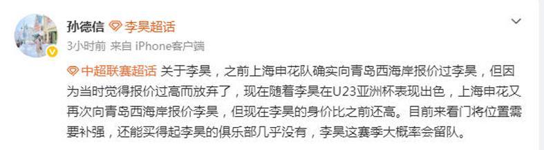 目前,李昊正在随U23国足参加U23亚洲杯,在小组赛中李昊表现非常出色。这令申花再次开出高价求购,但是从目前来看,李昊留在青岛西海岸的可能性更大。有球迷表示:“李昊踢完U23亚洲杯,保守身价50万欧元。”“李昊如果太贵,申花真没必要,‘女婿’也不是不能用。”“关系户NB啊!”